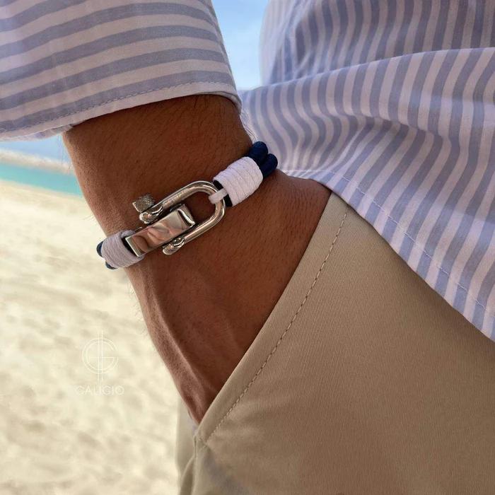 The blue tone brings a sense of depth and calm - inspired by the ocean and sky. The white thread accents add a refined contrast that enhances its timeless appeal. Whether paired with a t-shirt and jeans, button-up shirt, or smart-casual outfit, this men’s nautical bracelet delivers effortless style and subtle sophistication.