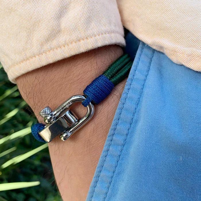 Binate Green Bracelet - a minimal, durable, and stylish men’s rope bracelet created for those who appreciate clean design with a nautical and modern touch. Handcrafted from premium nylon marine cord, it’s water-resistant, long-lasting, and made for everyday wear. The smarketdash stainless-steel shackle, combined with rich green rope and subtle blue thread accents, gives this nautical men’s bracelet a refined and confident character.